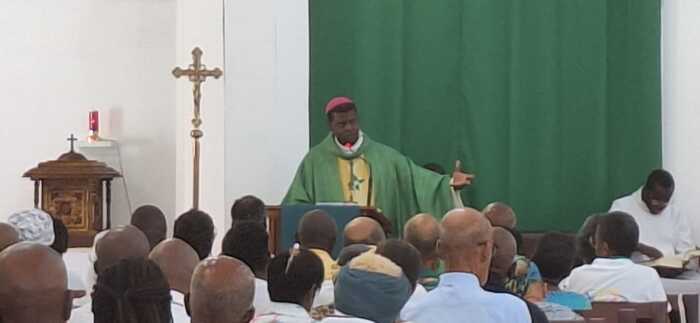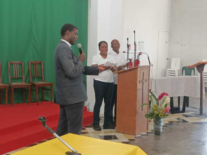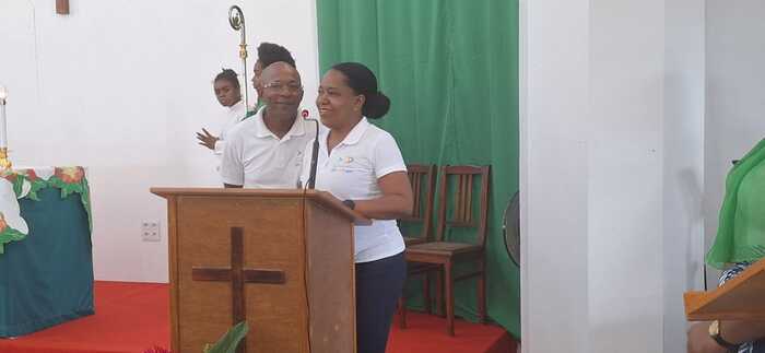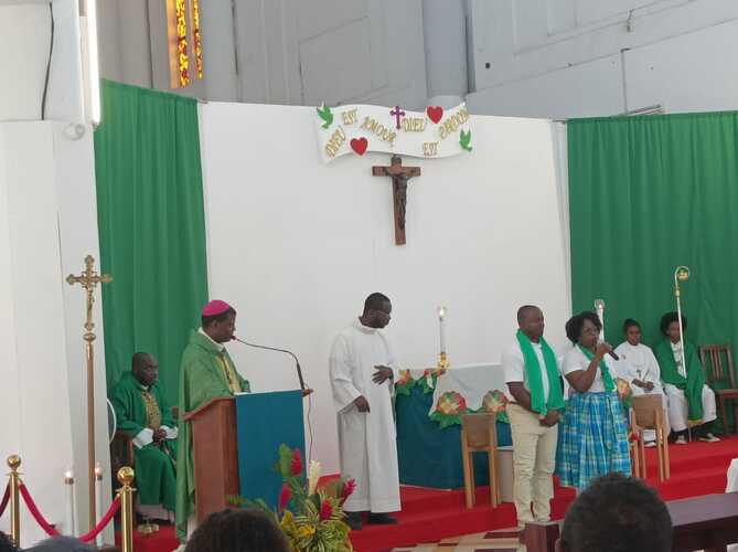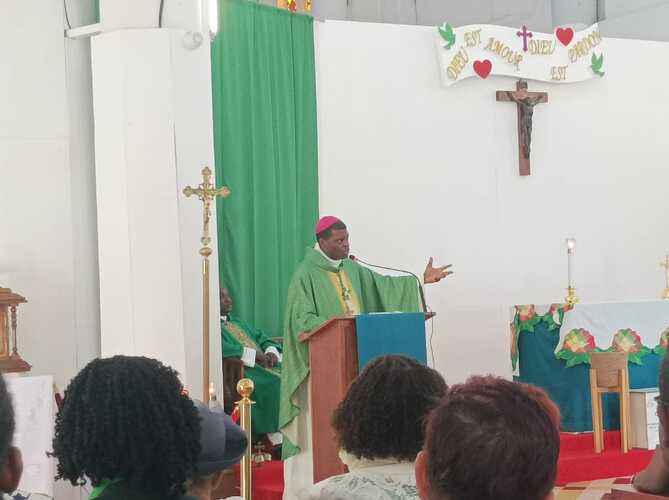 Cet exercice terminé, un moment de recueillement était dès lors proposé pour se préparer à la célébration eucharistique qu’a présidé à 10h, Mgr Philippe GUIOUGOU, avec à ses côtés le Père Godefroid, le curé de la paroisse. Une messe durant laquelle, le pasteur de notre diocèse a beaucoup insisté dans son homélie sur les grands défis que doivent relever nos familles guadeloupéennes pour incarner ce rempart de nature à prévenir les maux et dérives de notre société en rupture de repères. Après cette célébration dominicale à laquelle ont pris part également les fidèles de la paroisse, car c’était la 2ème messe, Mgr Philippe a enchainé avec son enseignement sur le thème du couple missionnaire. L’amour conjugal c’est l’annonce de l’Evangile par les actes a notamment prêché l’évêque de Guadeloupe. Le premier lieu de la mission du couple au sens de l’Eglise, c’est le foyer, a souligné Mgr Philippe GUIOUGOU, non sans avoir insisté sur la dimension vocationnelle intimement liée au mariage chrétien.